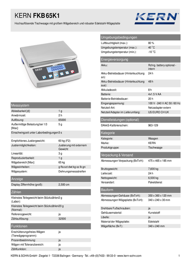 Kern FKB 65K1 Waga stołowa Zakres pomiaru maks. 65 kg Podziałka 1 g z sieci elektrycznej srebrny, biały, czarny