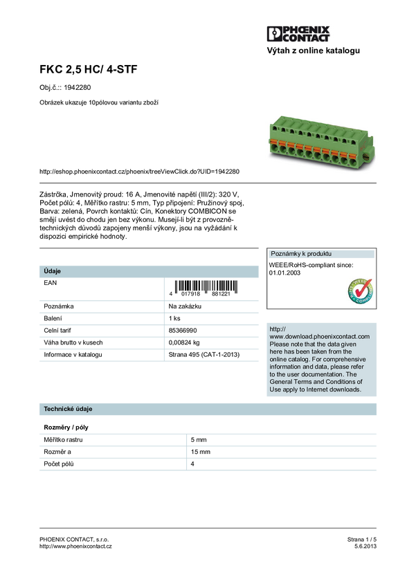 Phoenix Contact Obudowa złącza pin żeńskiego na kabel FKC Ilość pinów 4 Wymiary siatki: 5 mm 1942280 50 szt.