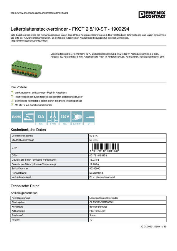 Phoenix Contact 1945041 Obudowa złącza pin żeńskiego na kabel FKC 2,5/20-ST-5,08, piny: 20, 12 A, 50 szt.