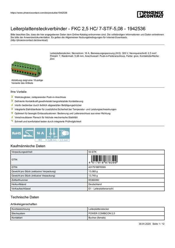 Phoenix Contact 1942536 Obudowa złącza pin żeńskiego na kabel FKC 2,5 HC/ 7-STF-5,08, piny: 7, 16 A, 50 szt.