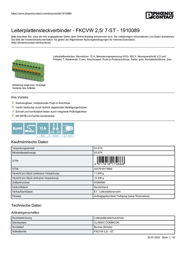 Phoenix Contact 1910089 Obudowa złącza pin żeńskiego na kabel FKCVW 2,5/ 7-ST, piny: 7, 12 A, 1 szt.
