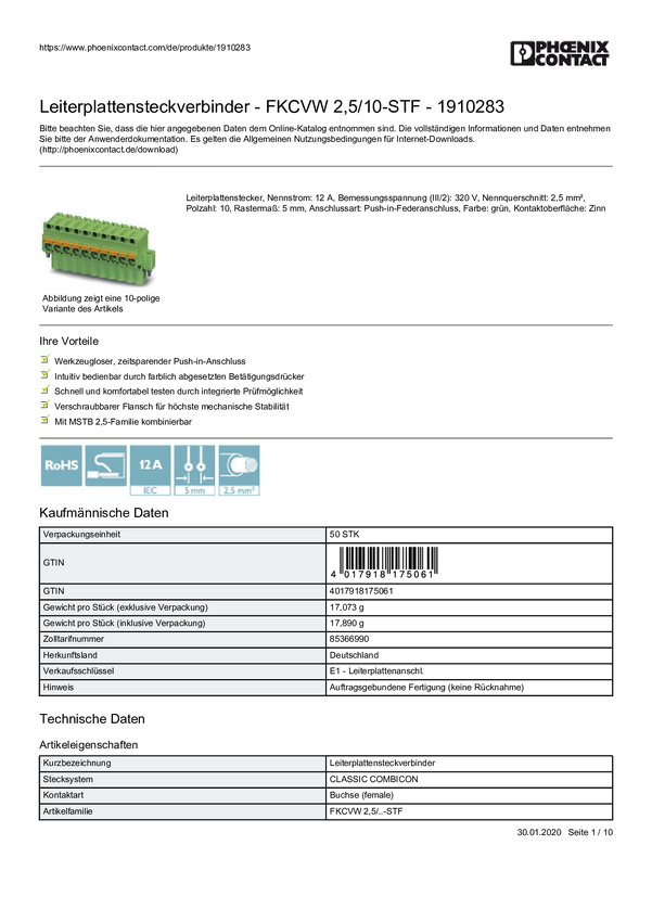 Phoenix Contact 1910283 Obudowa złącza pin żeńskiego na kabel FKCVW 2,5/10-STF, piny: 10, 12 A, 50 szt.