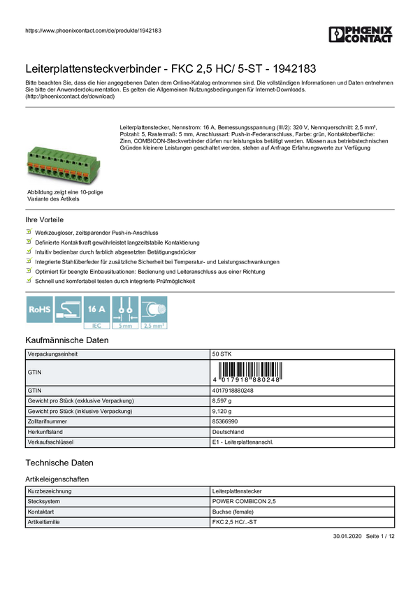 Phoenix Contact 1942400 Obudowa złącza pin żeńskiego na kabel FKC 2,5 HC/ 5-ST-5,08, wire-to-board, piny: 5, 16 A, 50 sz