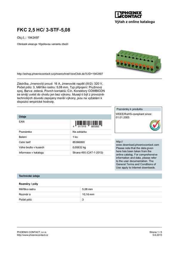 Phoenix Contact Obudowa złącza pin żeńskiego na kabel FKC Ilość pinów 6 Wymiary siatki: 5.08 mm 1942413 50 szt.