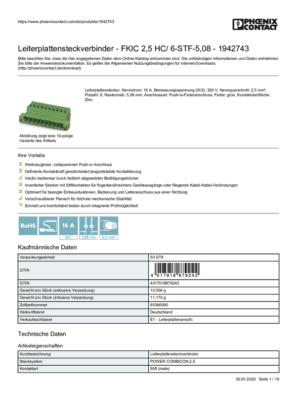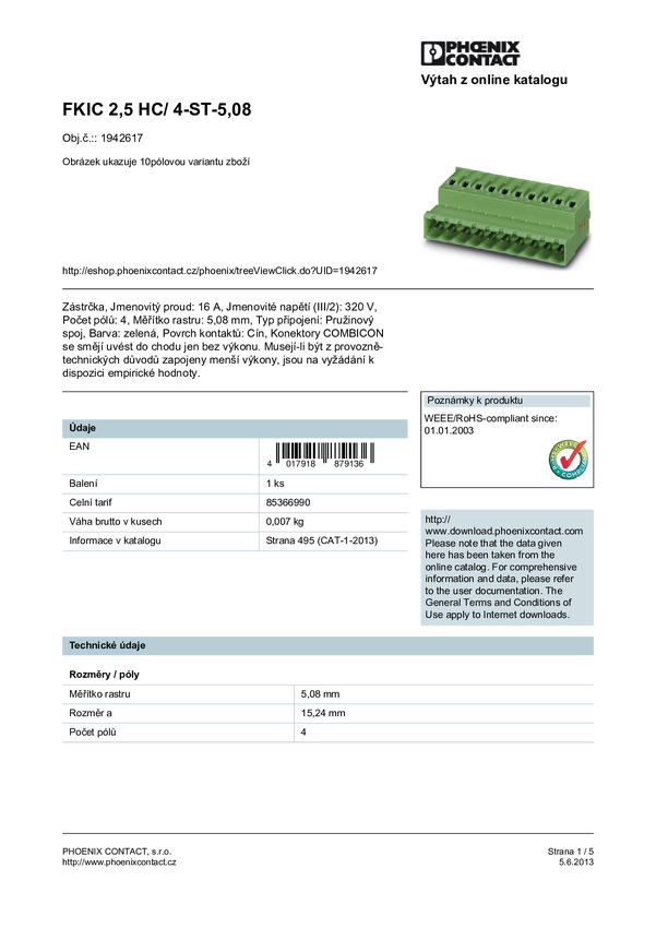 Phoenix Contact 1942617 Obudowa złącza pin męskiego na kabel FKIC 2,5 HC/ 4-ST-5,08, wire-to-board, piny: 4, 16 A, 100 s