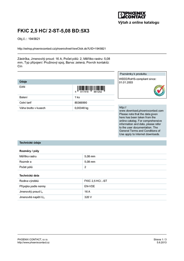 Phoenix Contact Obudowa złącza pin męskiego na kabel FKIC Ilość pinów 2 Wymiary siatki: 5.08 mm 1945821 100 szt.