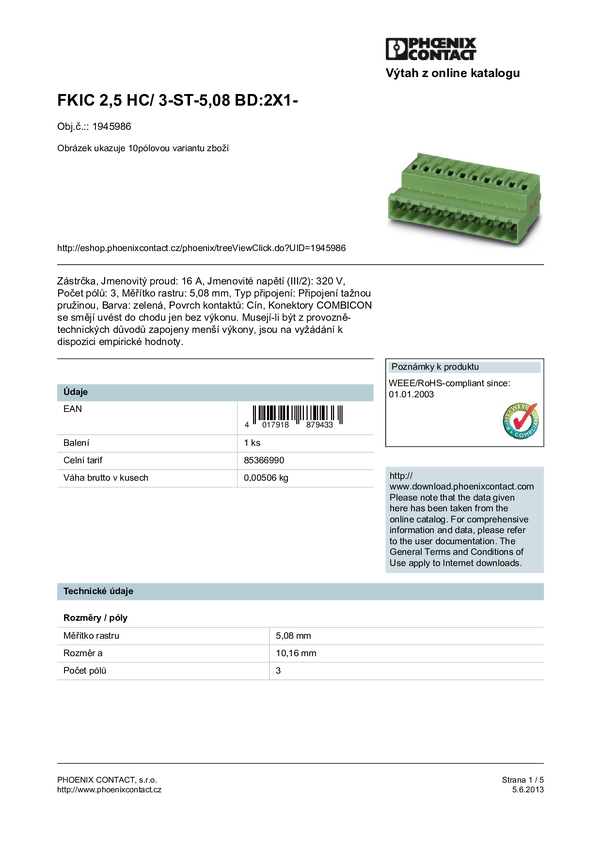 Phoenix Contact 1945928 Obudowa złącza pin męskiego na kabel FKIC 2,5 HC/ 3-ST-5,08 BD:4X1-, wire-to-board, piny: 3, 16