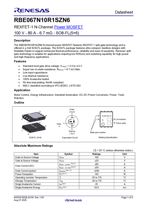 100V, 80A, 6.7mΩ, REXFET-1 N-Channel Power MOSFET in SO8-FL (5x6)