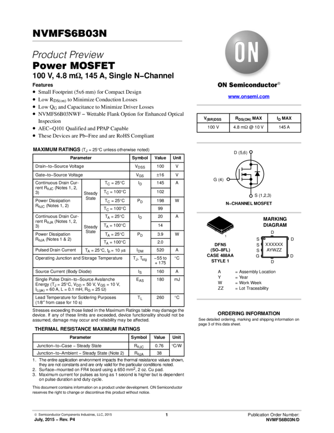 Power MOSFET 100V, 145A, 4.8 mOhm, Single N-Channel, SO8-FL.