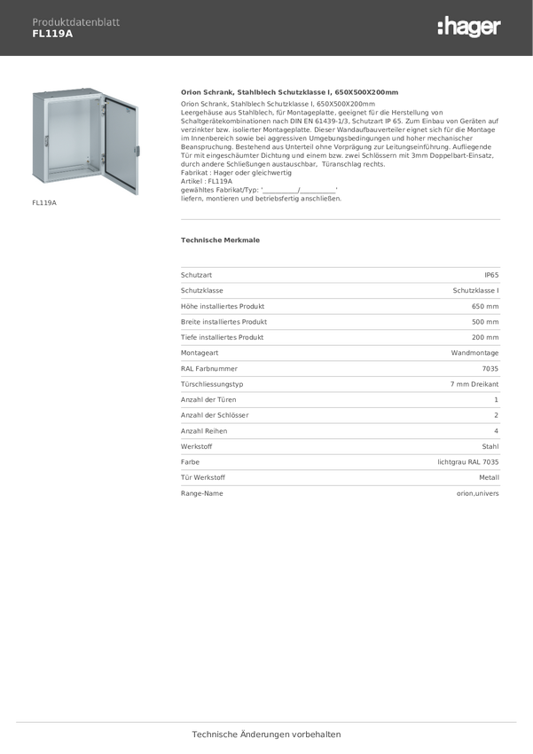 Szafka Hager FL119A, 500 x 650 x 200, stal, 1 szt.