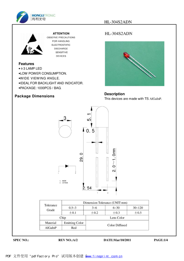 Dioda LED, 3mm, , 640 nm, 70 mCd, dyfuzyjna, 60 stopni, flangless, Honglitronic