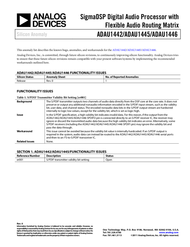 ADAU1442: SigmaDSP® Digital Audio Processor with Flexible Audio Routing Matrix