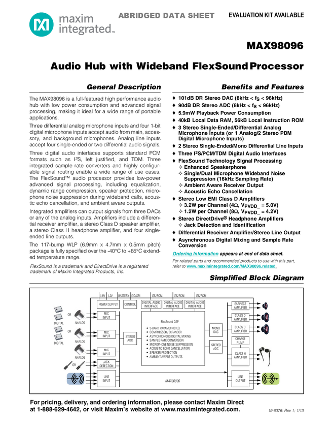 MAX98096 TINI Audio Hub with Wideband FlexSound Processor