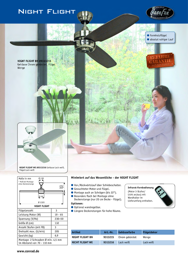 CasaFan Night Flight WE Wentylator sufitowy 65 W (Ø x W) 132 cm x 240 mm biały tryb zimowy, pilot zdalnego sterowania, m