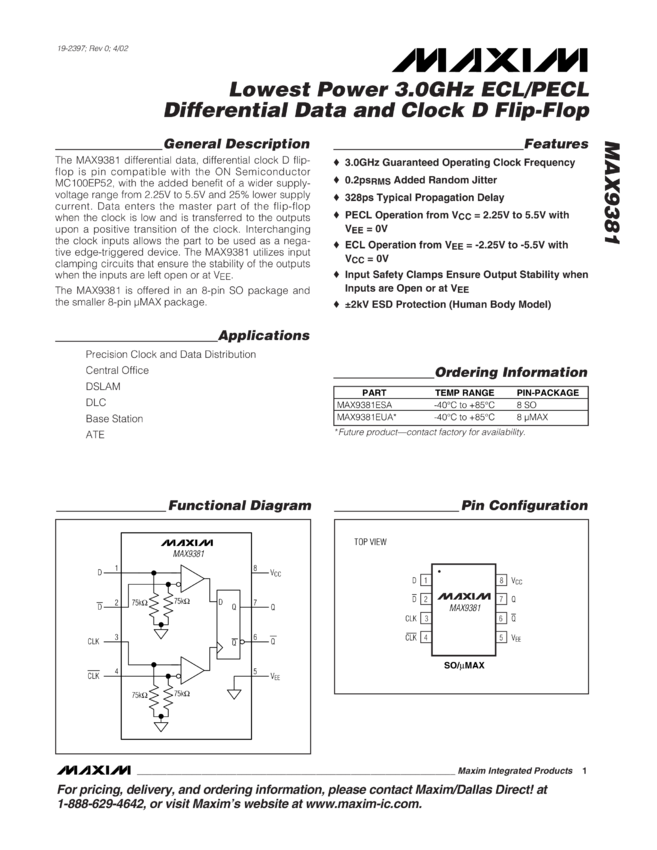 MAX9381 Lowest Power 3.0GHz ECL/PECL Differential Data and Clock D Flip-Flop