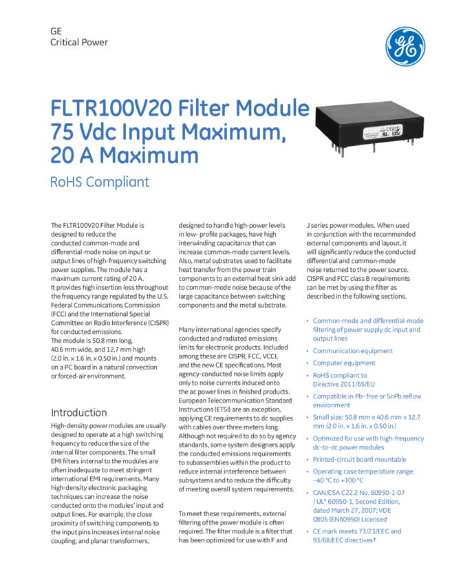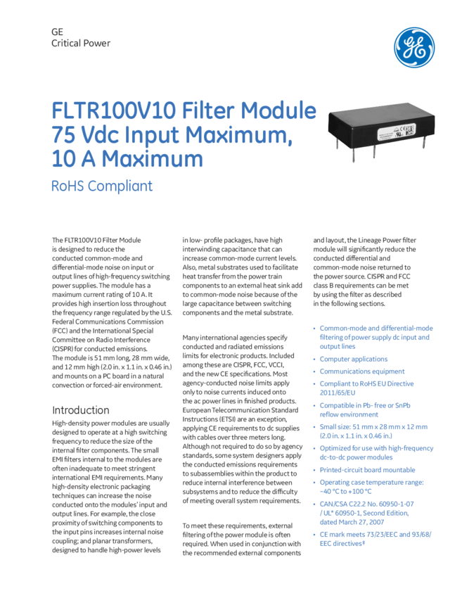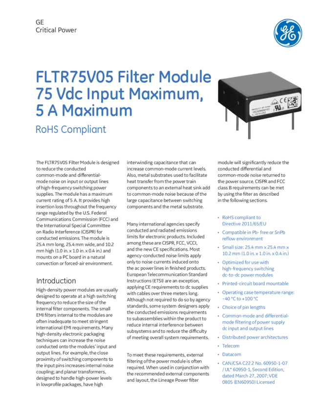 Input Filter Module 75VDC 12A -40°C to 85°C