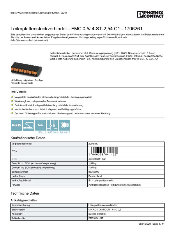 Phoenix Contact 1706261 Obudowa złącza pin żeńskiego na kabel FMC 0,5/ 4-ST-2,54 C1, piny: 4, 6 A, 1 szt.