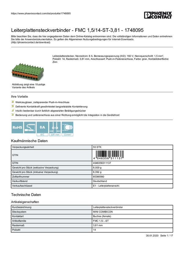 Phoenix Contact 1748095 Obudowa złącza pin żeńskiego na kabel FMC 1,5/14-ST-3,81, piny: 14, 8 A, 50 szt.