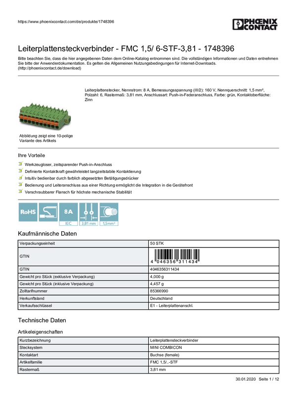 Phoenix Contact 1748396 Obudowa złącza pin żeńskiego na kabel FMC 1,5/ 6-STF-3,81, piny: 6, 8 A, 50 szt.