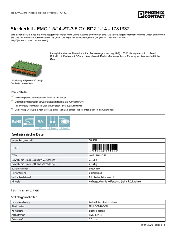 Phoenix Contact 1781337 Obudowa złącza pin żeńskiego na kabel FMC 1,5/14-ST-3,5 GY BD2:1-14, piny: 14, 8 A, 50 szt.