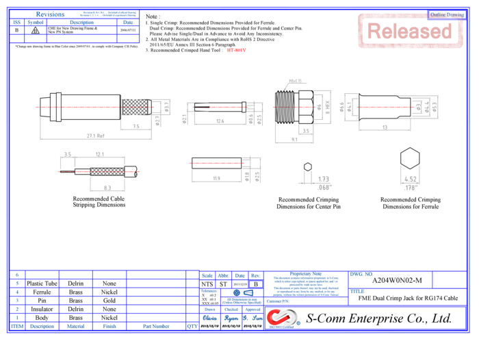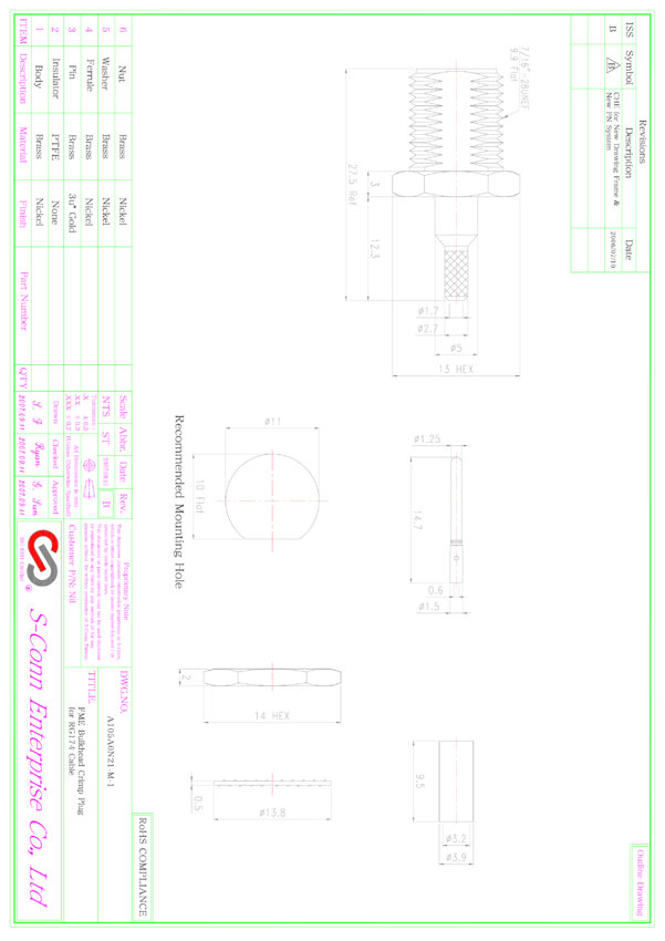 Złącze męskie, do mocowania w obudowę (chassis), zaciskane na kablu RG174, narzędzie zaciskajace N-HT336G (hex size 0.213")