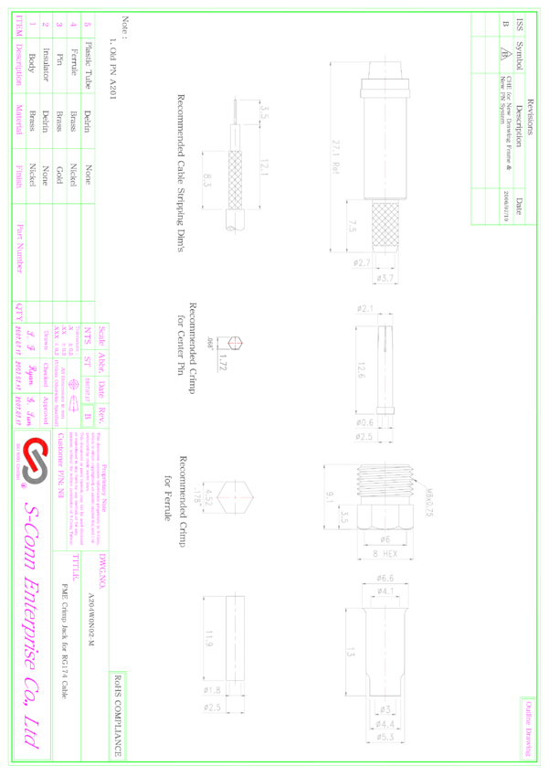 Złącze męskie, proste, zaciskane na kablu RG174, narzędzie zaciskajace N-HT336G lub N-HT801V (hex size 0.137)