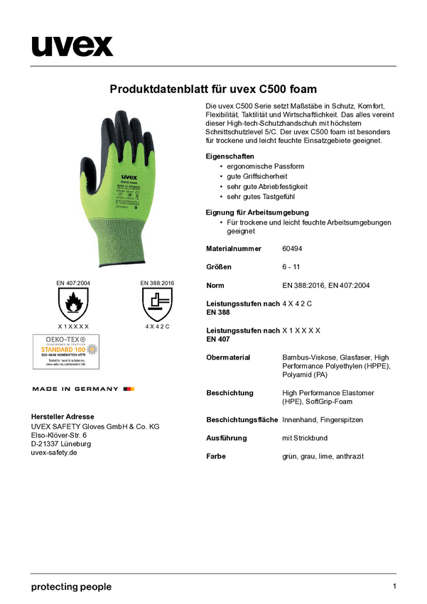 uvex C500 foam 6049407 Rękawice chroniące przed przecięciem Rozmiar rękawic: 7 EN 397 1 par(a)