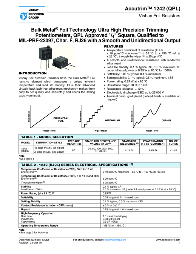 Res Metal Foil Trimmer 1K Ohm 10% 1/4W 21(Mech)Turn (7.37 X 4.45 X 6.35mm) Pin Thru-Hole Foam Pack/Box