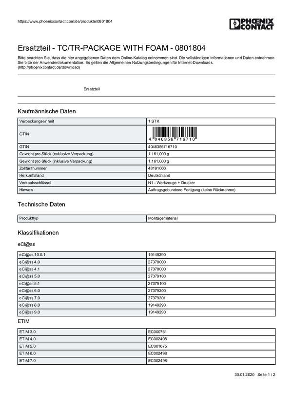 Phoenix Contact 0801804 TC/TR-PACKAGE WITH FOAM Część zapasowa 1 szt.
