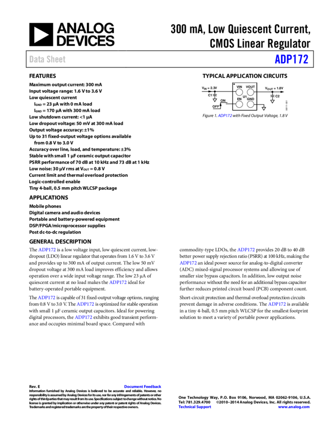 ADP172: 300 mA, Low Quiescent Current, fixed-output, CMOS Linear Regulator in a WLCSP footprint