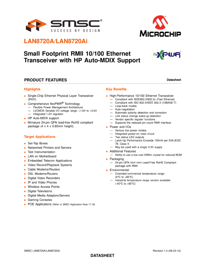 LAN8720A/LAN8720Ai Small Footprint RMII 10/100 Ethernet Transceiver with HP Aut (08/23/2012)