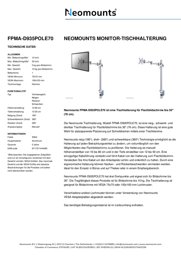 Neomounts FPMA-D935POLE70 Uchwyt do monitora, stołowy 25,4 cm (10") - 76,2 cm (30") Przenośny, Obrotowy, Uchylny, z regu