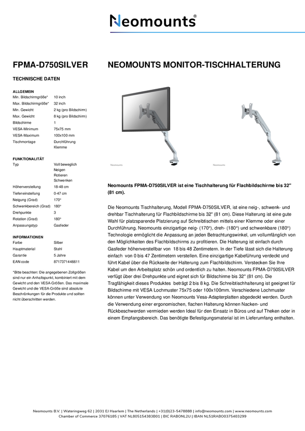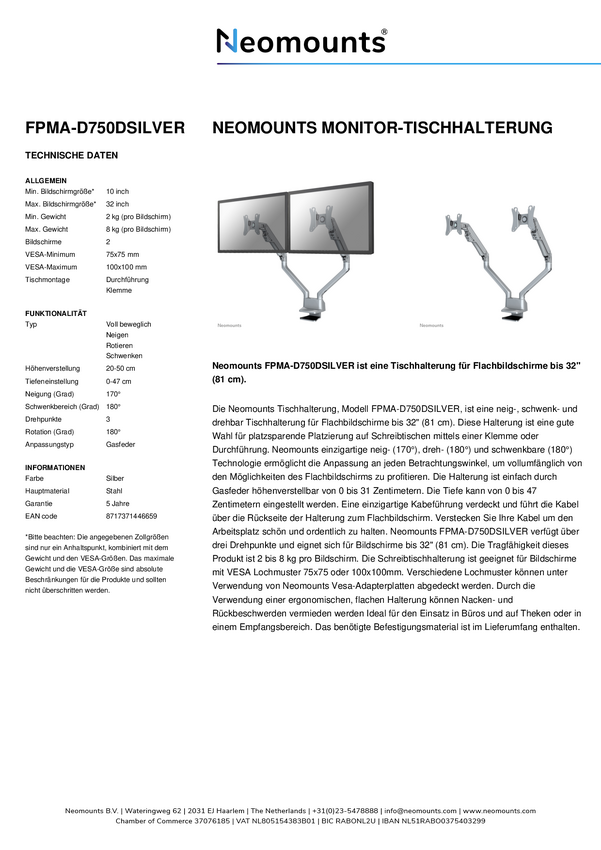 Neomounts FPMA-D750DSILVER Uchwyt do monitora, stołowy 25,4 cm (10") - 81,3 cm (32") Przenośny, Obrotowy, Uchylny, z reg