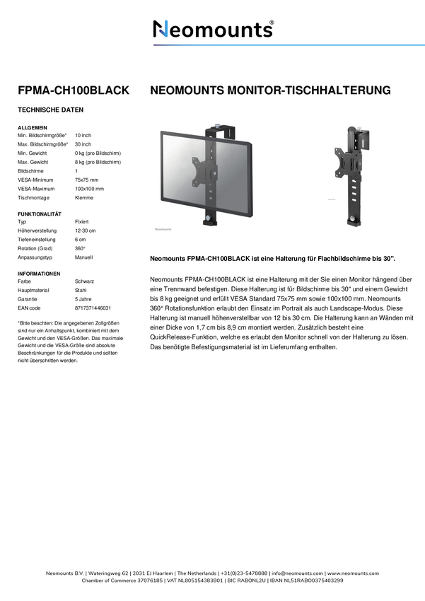 Neomounts FPMA-CH100BLACK Uchwyt do monitora, stołowy 25,4 cm (10") - 76,2 cm (30") czarny