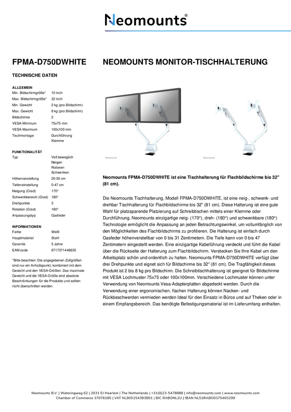 Neomounts FPMA-D750DWHITE Uchwyt do monitora, stołowy 25,4 cm (10") - 81,3 cm (32") Przenośny, Obrotowy, Obrotowy, z reg