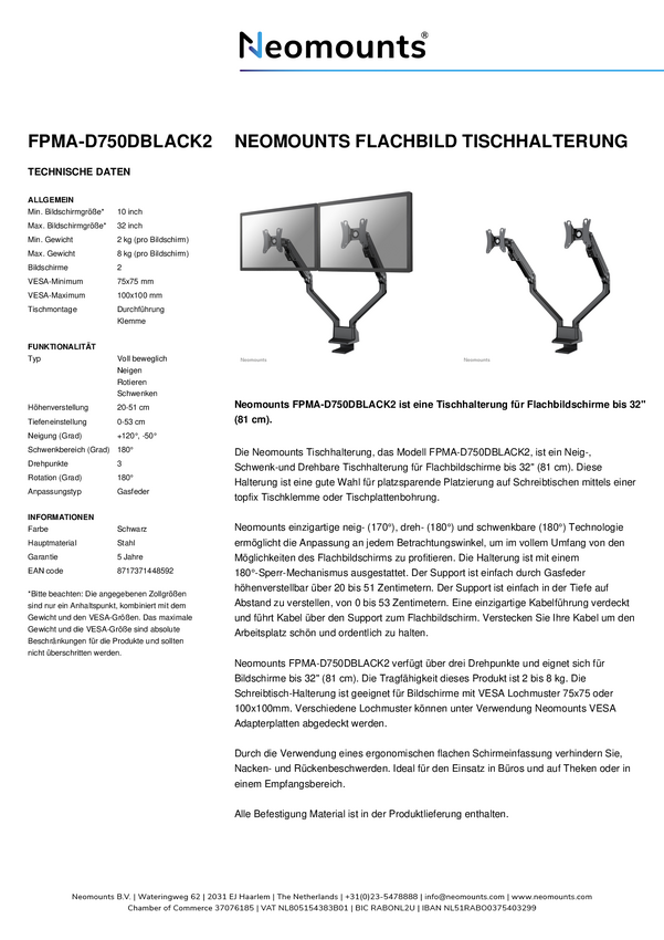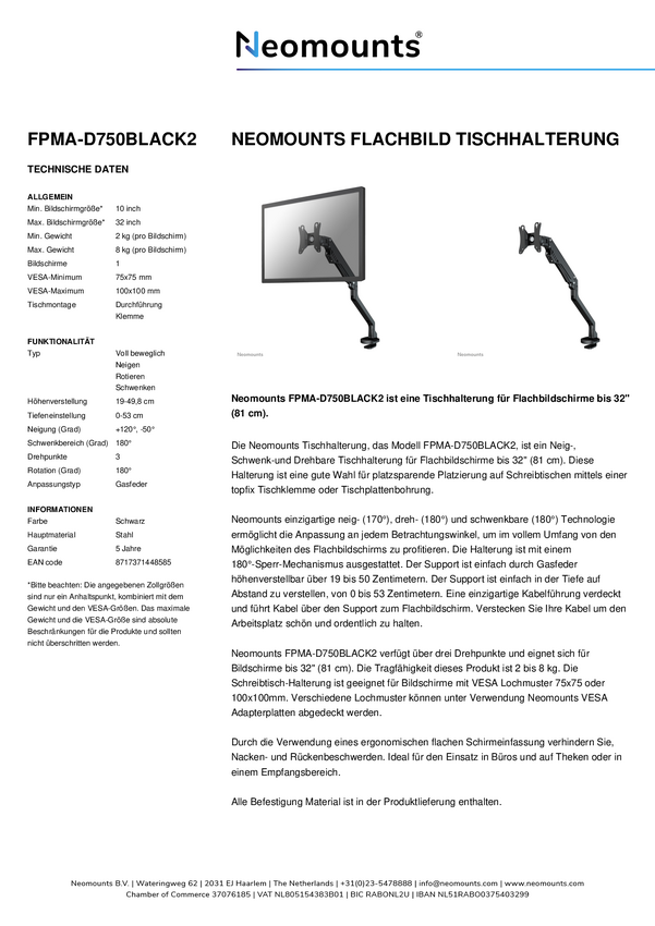Neomounts marki Newstar FPMA-D750DBLACK2 to uchwyt stołowy do płaskich ekranów do 32 (81 cm).