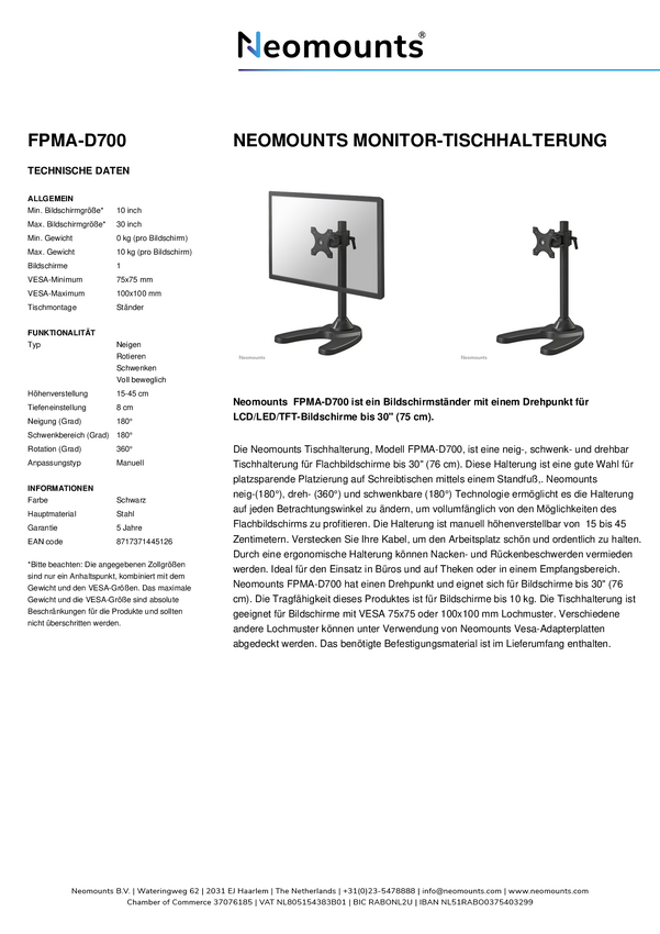 Neomounts FPMA-D700 Stojak na 1 ekran do monitora - 10-30" - 0-10 kg - Czarny