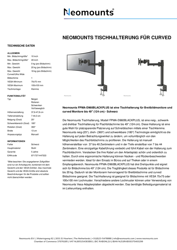 Neomounts FPMA-D960BLACKPLUS ramię do monitora 1 ekran - 10-49" - 0-20 kg (wygięty 18 kg) - czarny