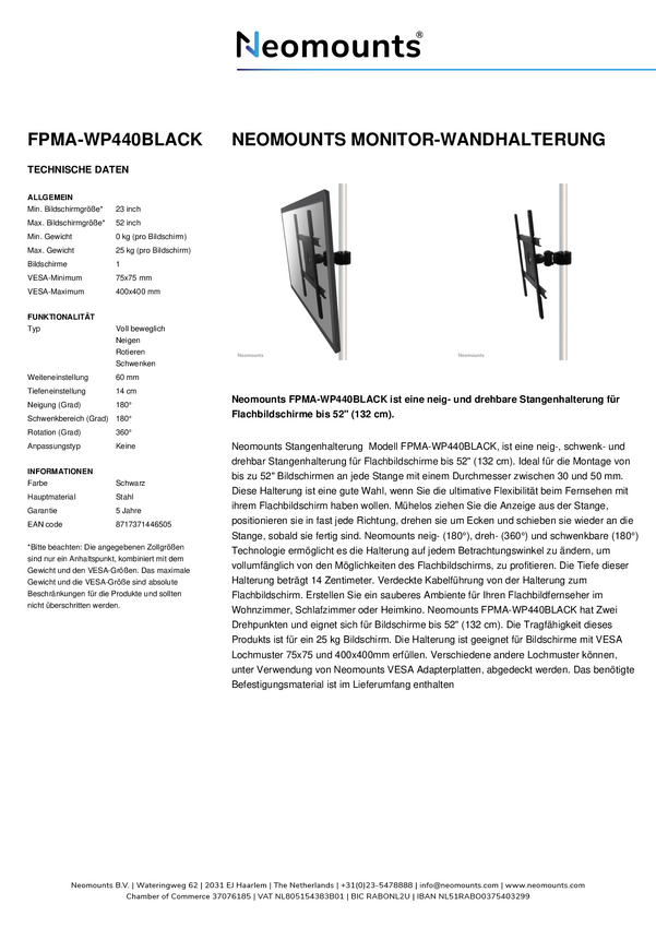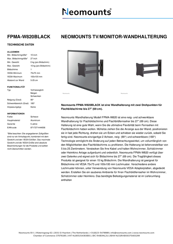 Neomounts FPMA-W820BLACK Uchwyt ścienny do monitora/telewizora z pełnym przegubem - 10-27" - maks. 15 kg - VESA 75x75-10