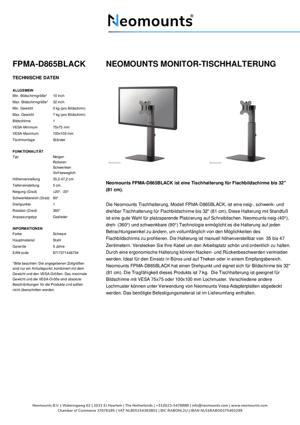 Neomounts FPMA-D865BLACK Stojak na monitor do 1 ekranu - 10-32" - 0-7 kg - sprężyna gazowa - czarny