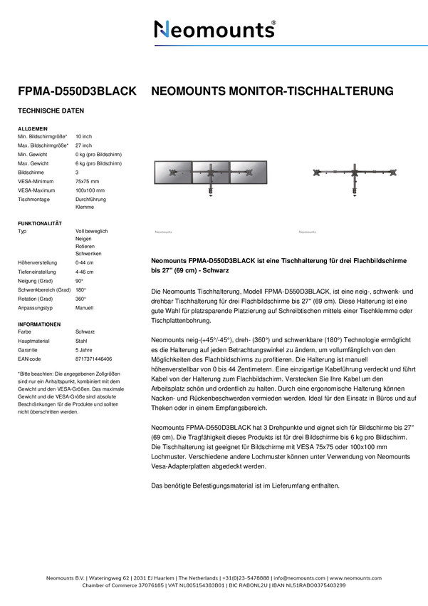 Neomounts FPMA-D550D3BLACK Ramię do monitora na 3 ekrany - 10-27" - 0-6 kg/ekran - czarne