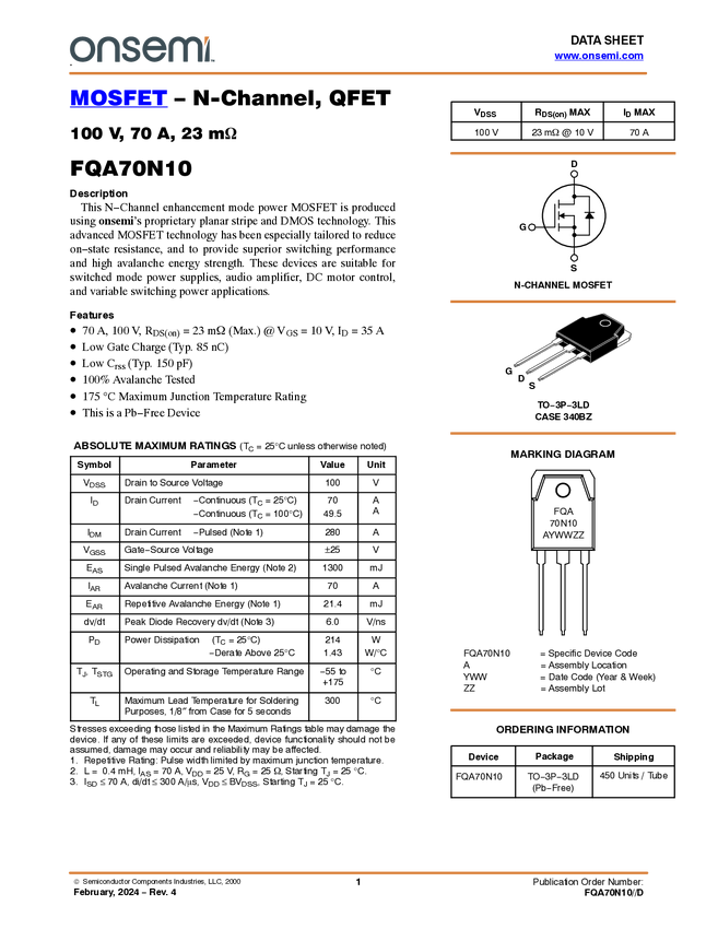 N-Channel QFET® MOSFET 100V, 70A, 23mΩ