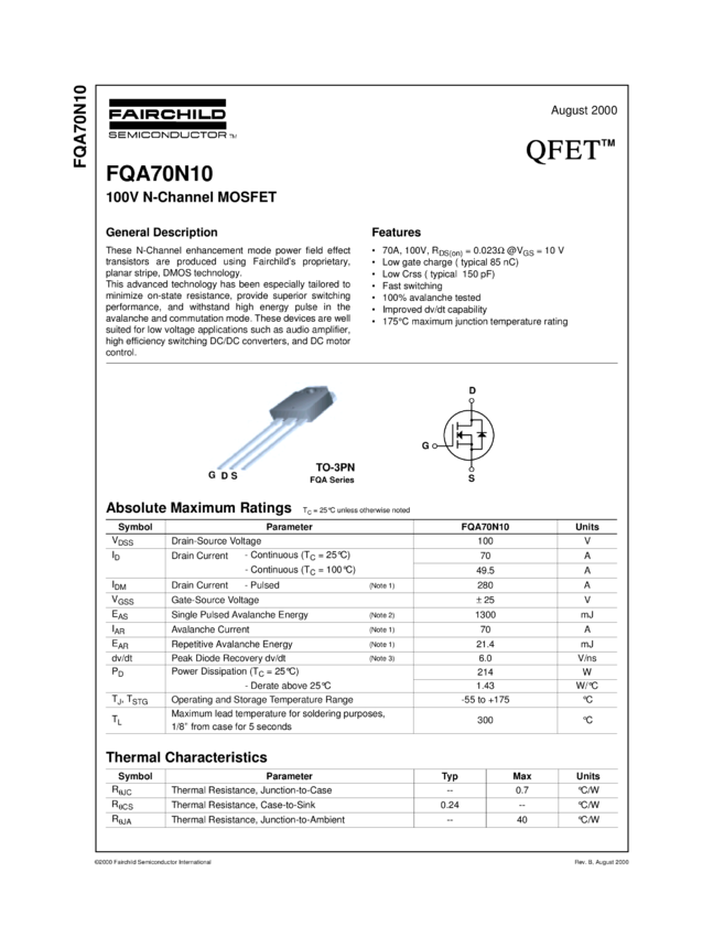 N-Channel QFET<sup>®</sup> MOSFET 100V, 70A, 23mΩ