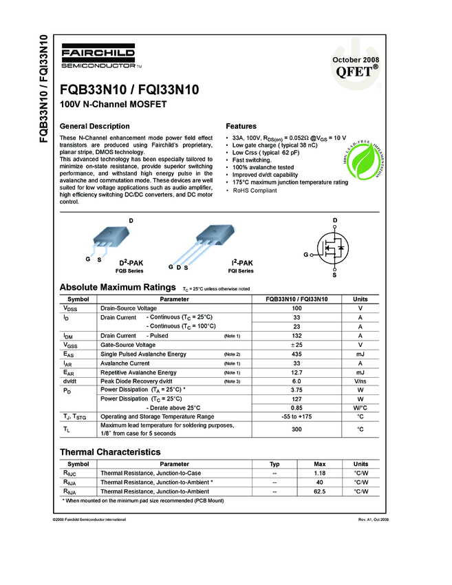 N-Channel QFET® MOSFET 100V, 33A, 52mΩ