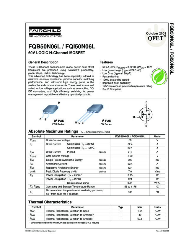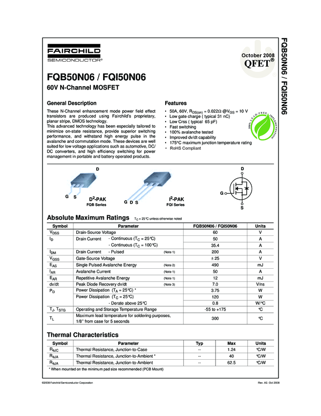N-Channel QFET® MOSFET 60V, 50A, 22mΩ