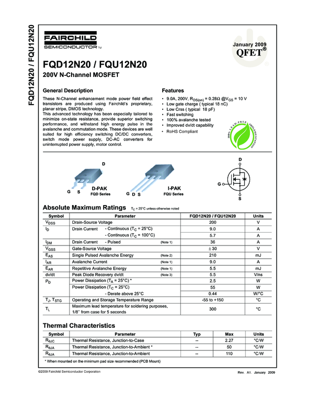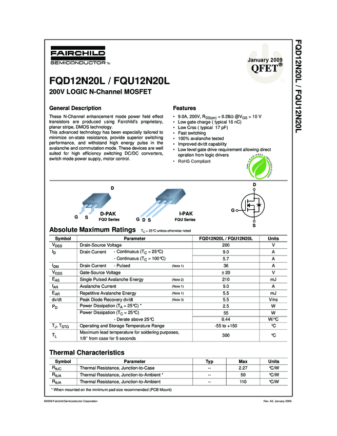 N-Channel QFET® MOSFET 200V, 9.0A, 280mΩ