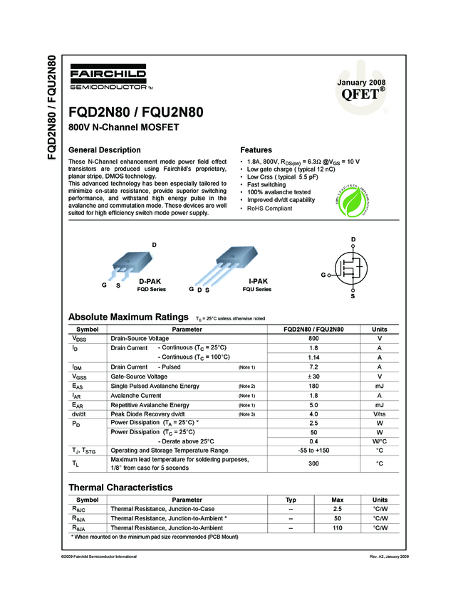 N-Channel QFET® MOSFET 800V, 1.8A, 6.3Ω