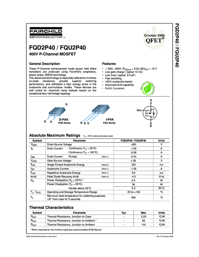 P-Channel QFET® MOSFET -400V, -1.56A, 6.5Ω