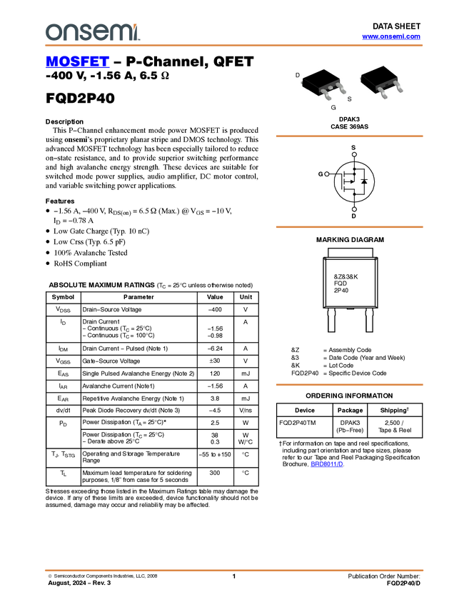 Power MOSFET, P-Channel, QFET<sup>®, -400 V, -1.56 A, 6.5 Ω, DPAK