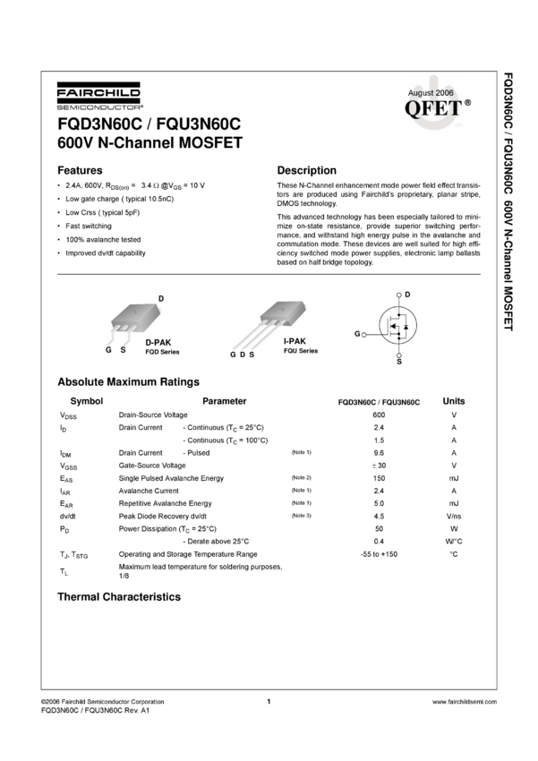 N-Channel QFET® MOSFET 600V, 2.4A, 3.4Ω